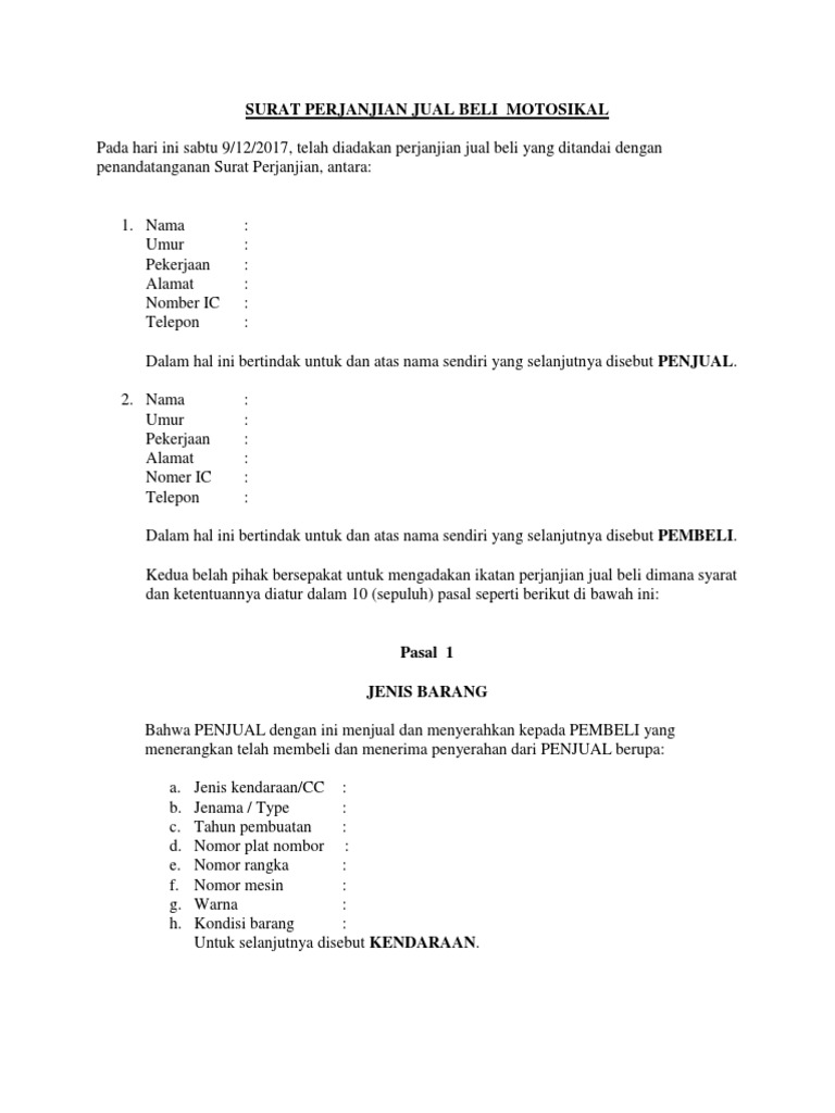 Surat Perjanjian Jual Beli Motosikal Pdf